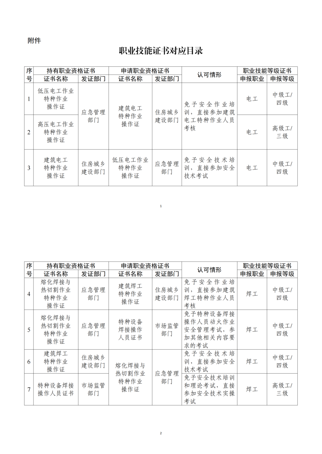 (二)推进焊工职业资格证书互通互认。取得应急管理部门颁发的合法有效的熔化焊接与热切割作业特种作业操作证的人员,在向颁发建筑焊工特种作业操作证地区的住房城乡建设主管部门申请相应操作证时,可免予安全作业培训,直接参加建筑焊工特种作业人员考核;在申请市场监管部门特种设备焊接操作人员证书时,可免予特种设备焊接操作人员动火作业安全管理考试,参加其他相关内容要求的考试。取得住房城乡建设部门颁发的合法有效的建筑焊工特种作业操作证的人员,在申请应急管理部门熔化焊接与热切割作业特种作业操作证时,可免予安全技术培训,直接参加安全技术考试。取得市场监管部门颁发的合法有效的特种设备焊接操作人员证书的人员,在申请应急管理部门熔化焊接与热切割作业特种作业操作证时,可免予安全技术培训和理论考试,直接参加安全技术实操考试。参见附件中序号4—7。